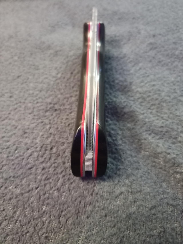 Ses plaquettes sont en ébène sur intercalaires en fibre vulcanisée rouge.